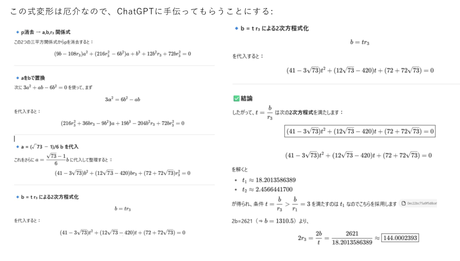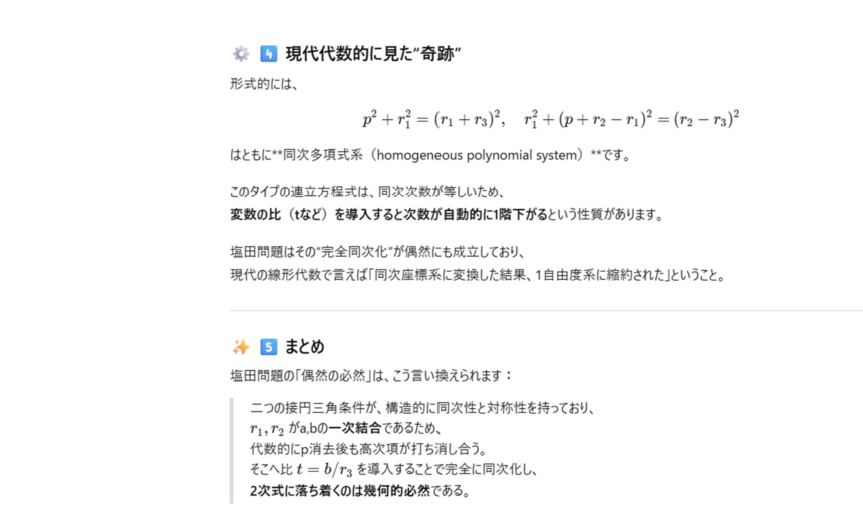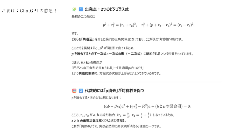 この答えは算額に書いてある答えとピッタリである。なぜ、江戸時代にこのような計算ができたのか!?これを解いてもらったAIに感想を聞くと次のような数学的コメントが出てきた。ほんと賢い!