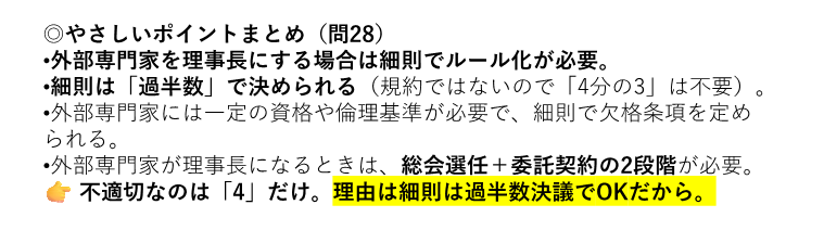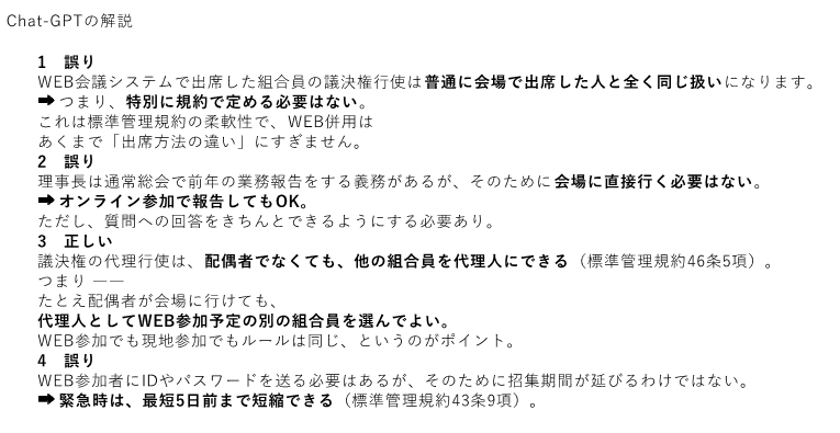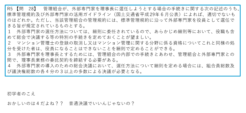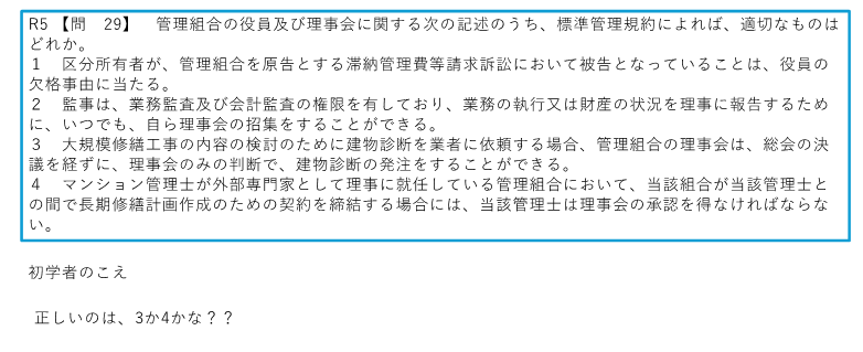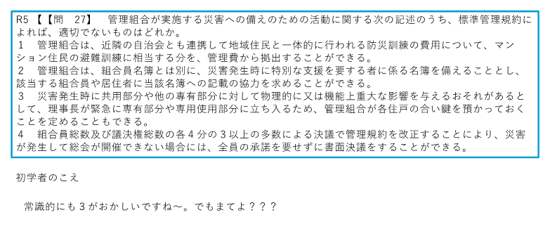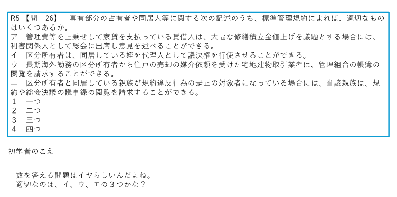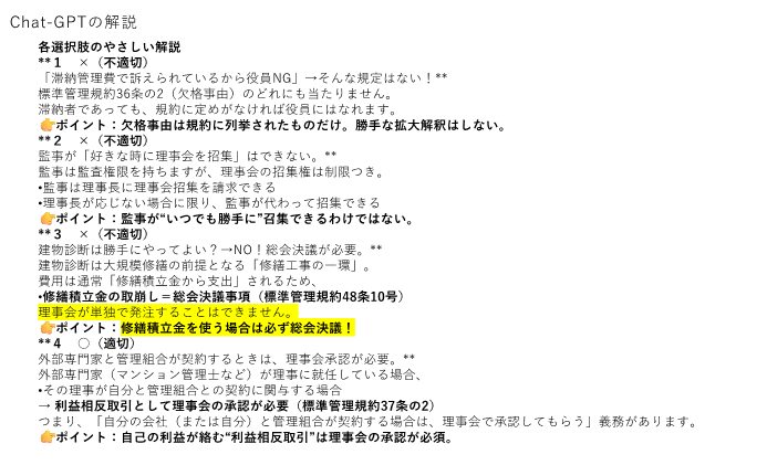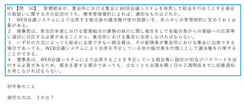 雑記 マンション管理士試験令和5年 問26-30 2025年11月25日 今回は、標準管理規約についての問題です。 はい、今回はこれで終わりです。 投稿ナビゲーション GUGA 生成AIパスポート試験合格!