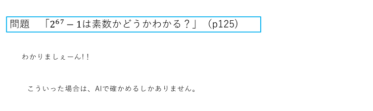 というようなことで、今回の問題も、コンピュータがなければ解けません。27桁の数字がわかって何になるの?と言われそうですが。