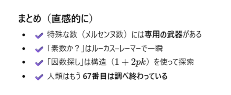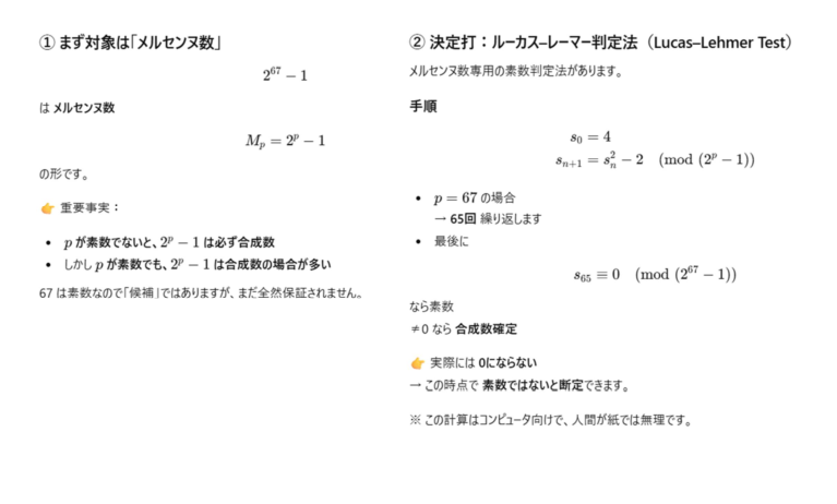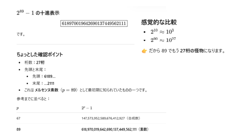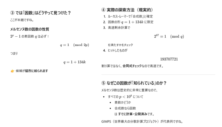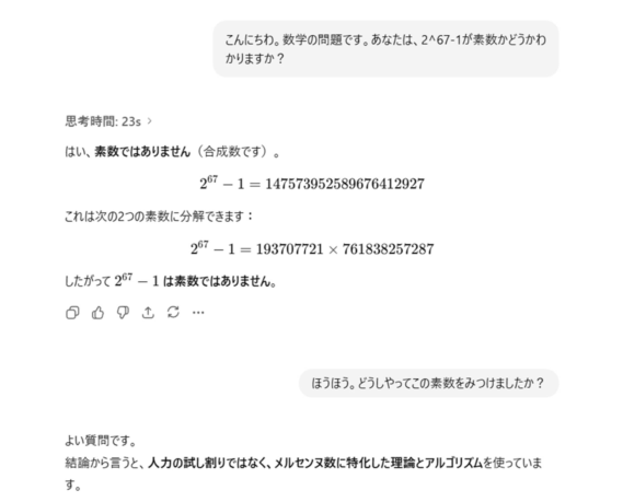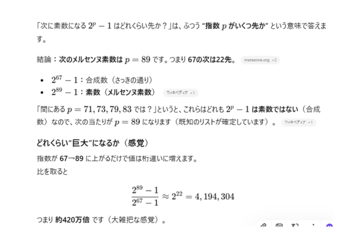 1分もかからずに答えを見つけてくるのですからすごいですね。AIの思考の後を追跡します。そもそも、メルセンヌ数というのですね。このタイプの数のことを。