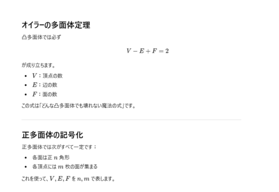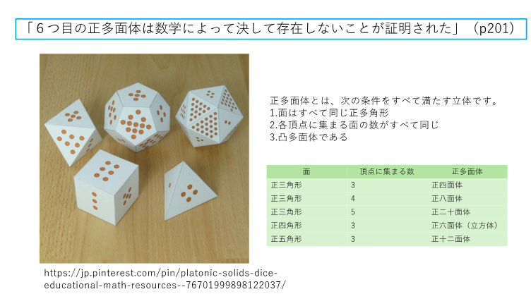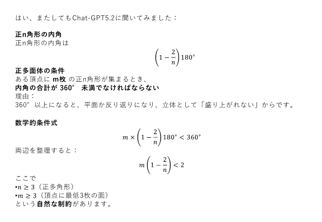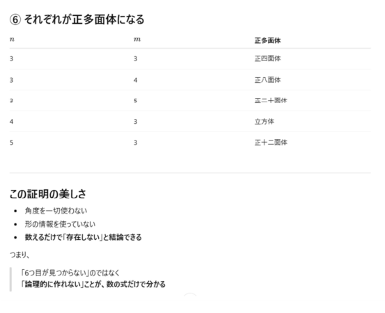 へぇ~。4次元にも“正多面体の仲間”は存在しますが、やはり有限個しかなく、しかも6種類だけです。4次元では「多面体」ではなく 四次元正多胞体(regular polychoron) と呼びますって。