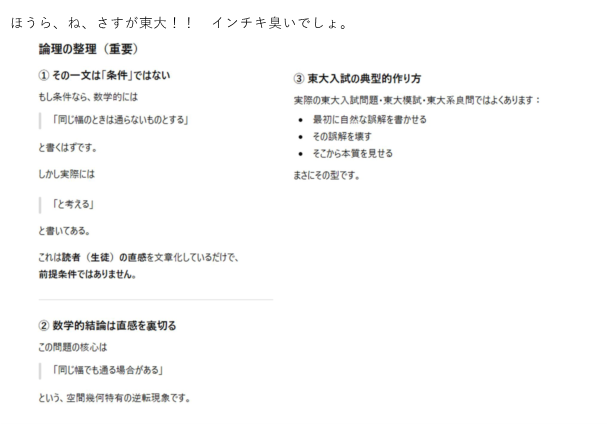 ということで、少々後味が悪いし、こんな問題が解けないと入れない東大って(・・・なんとなく「東大話法」につなげてしまって)「ああ、やっぱりね!」と、東大をディスってしまう感覚に襲われましたが、入試問題は合理的なものであった(と、信じたいですね)。