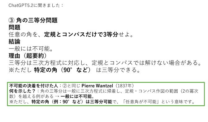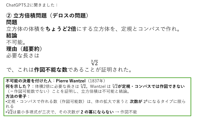 本の紹介 算数・数学コラム 「青の数学」-王城夕紀 著 の問題㉑ 2026年2月16日 今度の問題は、ギリシャ時代からの歴史ある問題ですね。 いずれも1800年代に解決されていますが、解決まで2000年もかかってますね。途方もない話です。 投稿ナビゲーション 会社情報の取得~登記簿謄本(全部事項証明書)を見てみよう!