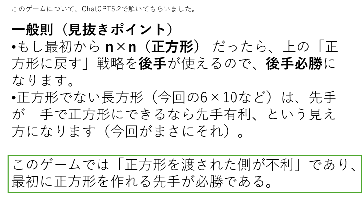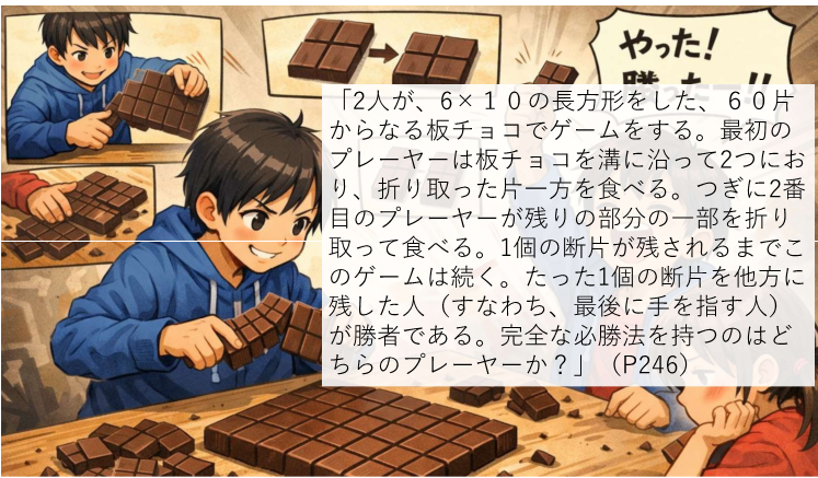本の紹介 算数・数学コラム 「青の数学」-王城夕紀 著 の問題㉒ 2026年2月18日 今度はゲームの問題ですね。 ゲームでも何でも、ChatGPT5.2は強いですね~(^_-)-☆ 投稿ナビゲーション 「青の数学」-王城夕紀 著 の問題㉑